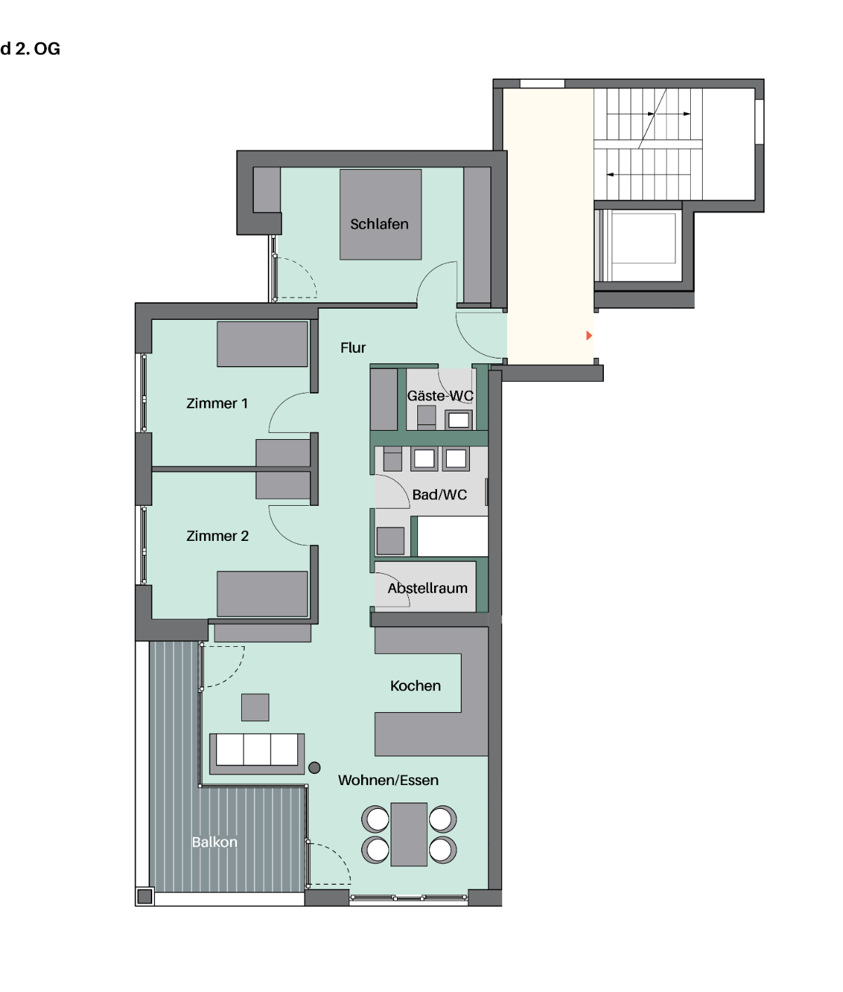 Die enthaltenen Gebäudeinformationen, sowie die abgebildeten Grundrisse inkl. den Einrichtungsgegenständen dienen ausschließlich als Gestaltungsvorschlag und sind nicht Vertragsgegenstand. Die Raumflächen beruhen auf lichten Baumaßen des aktuellen Planungsstands und dienen zur Orientierung.